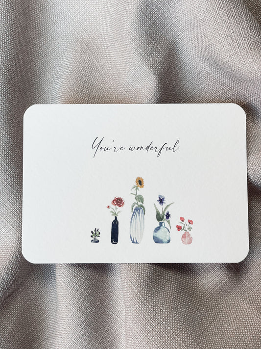 Onze wenskaarten zijn met liefde geïllustreerd in zachte aquarelstijl en gedrukt op handig A6-formaat met afgeronde hoeken. Elk kaartje komt met een warme kraftenvelop, helemaal klaar om iemand een glimlach te bezorgen.