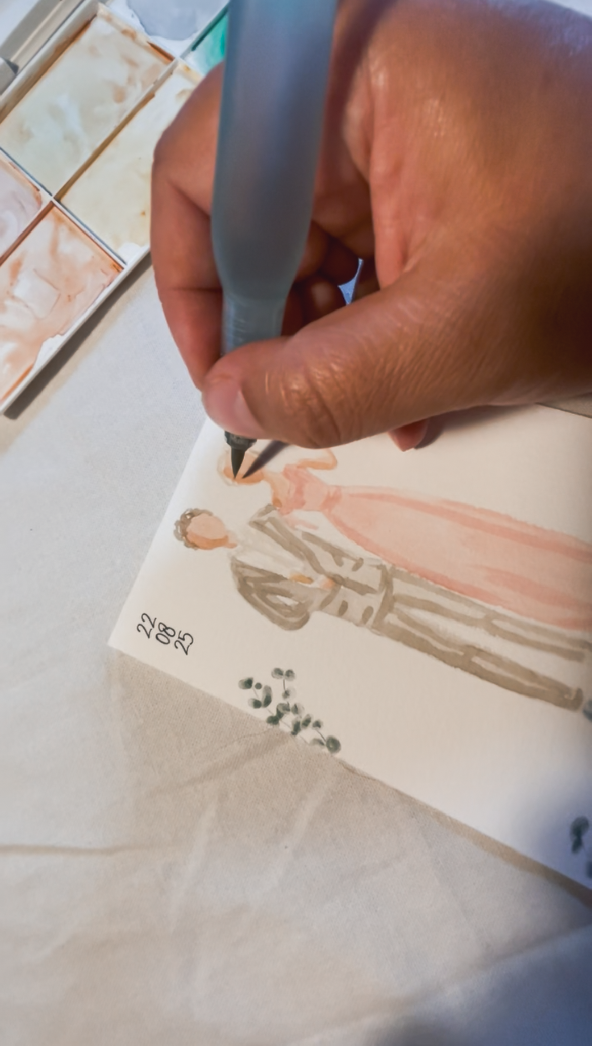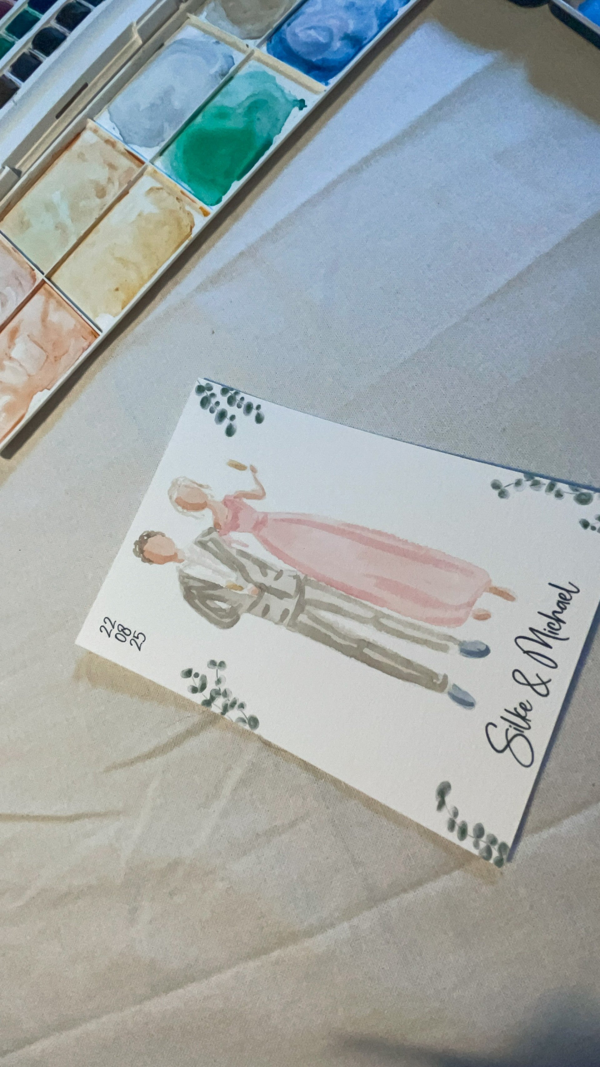 Bij binnenkomst maak ik een foto van je gasten in hun mooiste feestoutfit. Vervolgens ga ik aan de slag: binnen 7 tot 10 minuten transformeer ik die eerste indruk tot een handgeschilderd aquarelportret. Gasten kunnen live meekijken hoe hun portret langzaam tot leven komt – een moment van verwondering én entertainment in één.