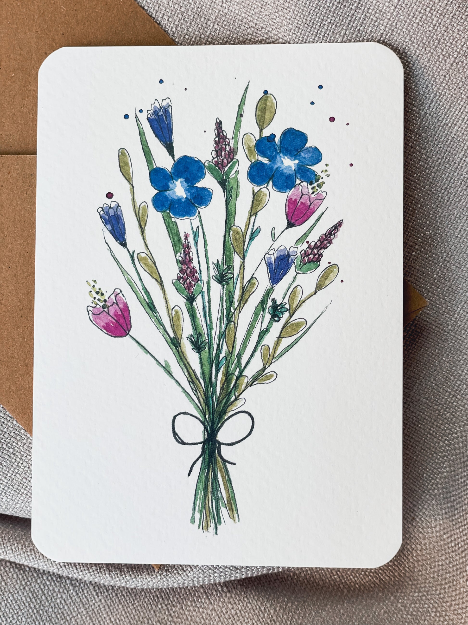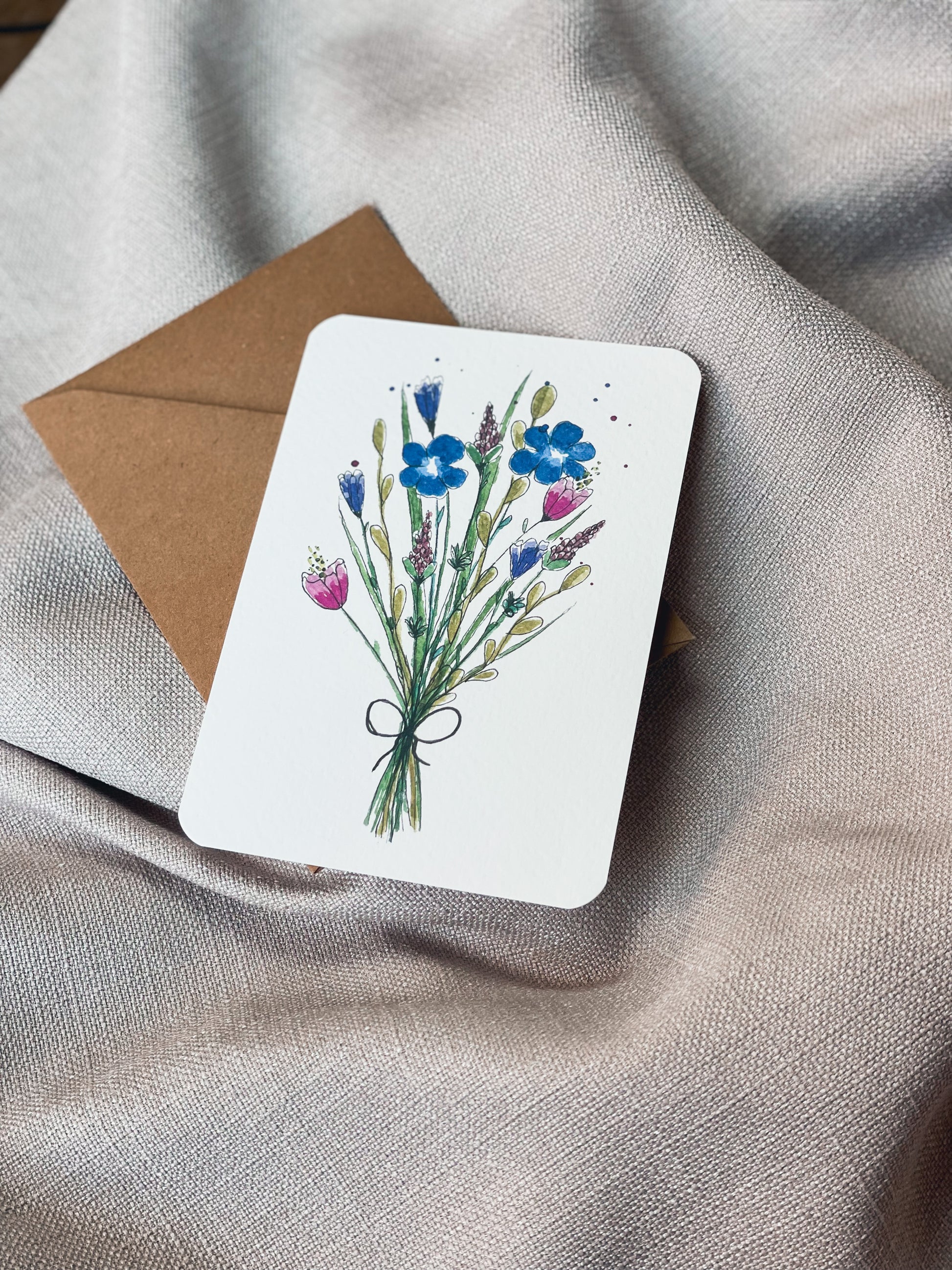 Wenskaarten in A6 formaat met ronde hoeken en bijpassende kraft enveloppe. De kaarten zijn eigen ontwerp en illustratie.