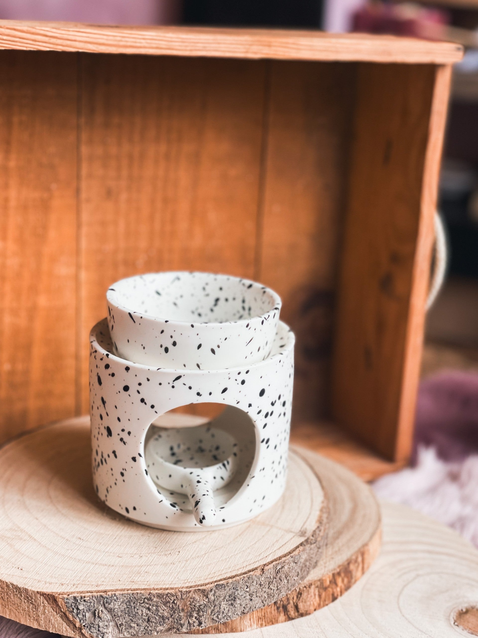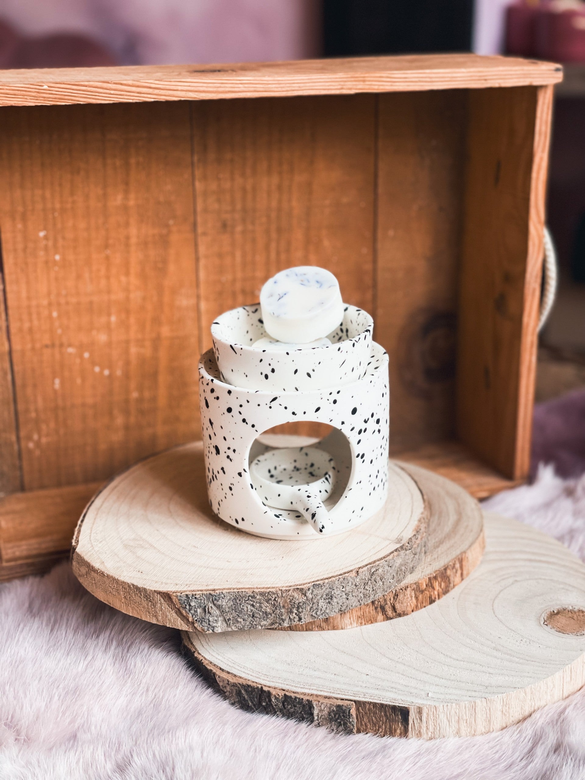 Deze moderne keramische meltsbrander is een stijlvolle toevoeging aan elk interieur. De witte afwerking met subtiele zwarte spikkels geeft de brander een eigentijdse en speelse uitstraling, perfect om sfeer en geur in huis te brengen.