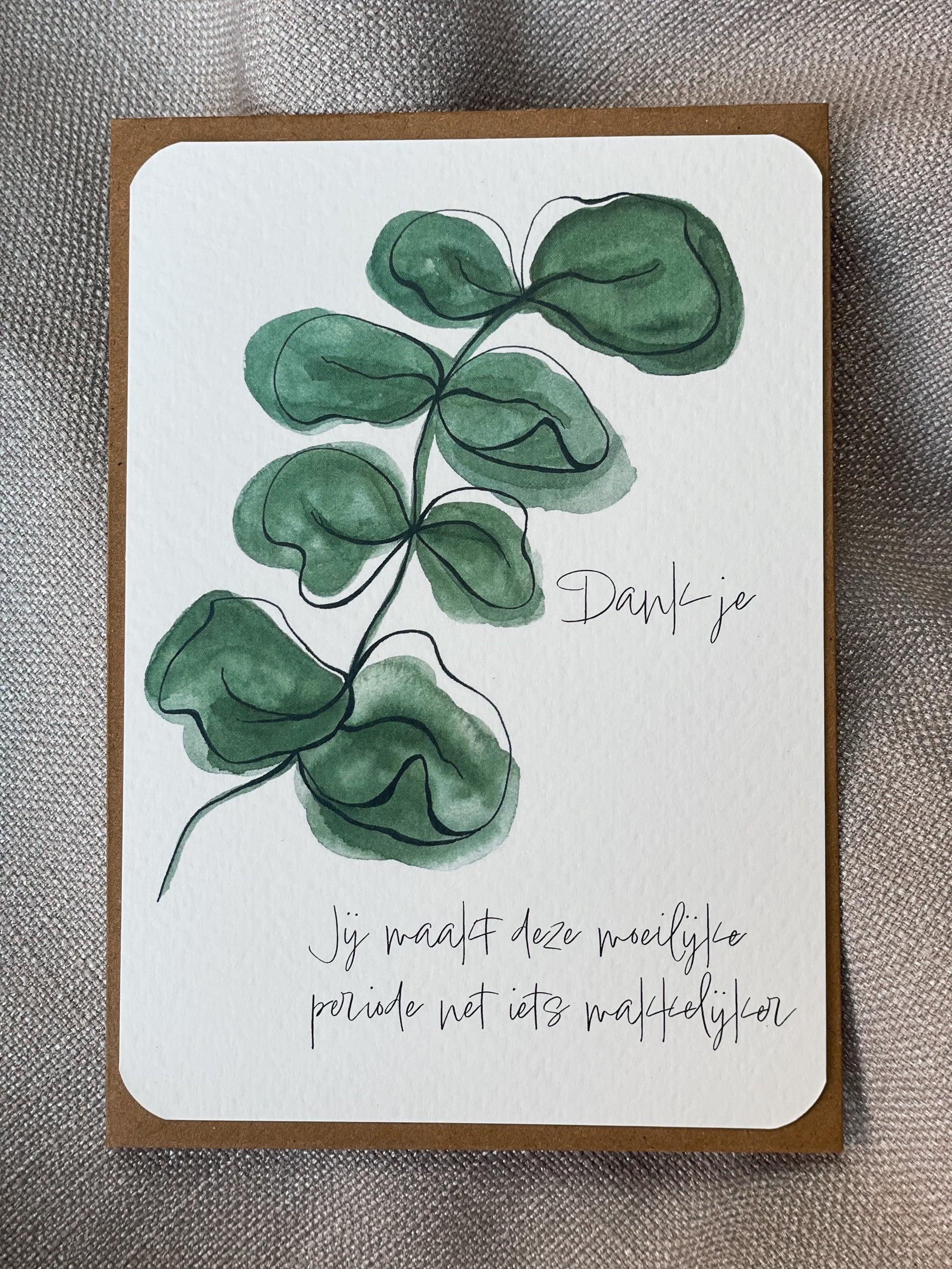 Wenskaarten in A6 formaat met ronde hoeken en bijpassende kraft enveloppe. De kaarten zijn eigen ontwerp en illustratie.