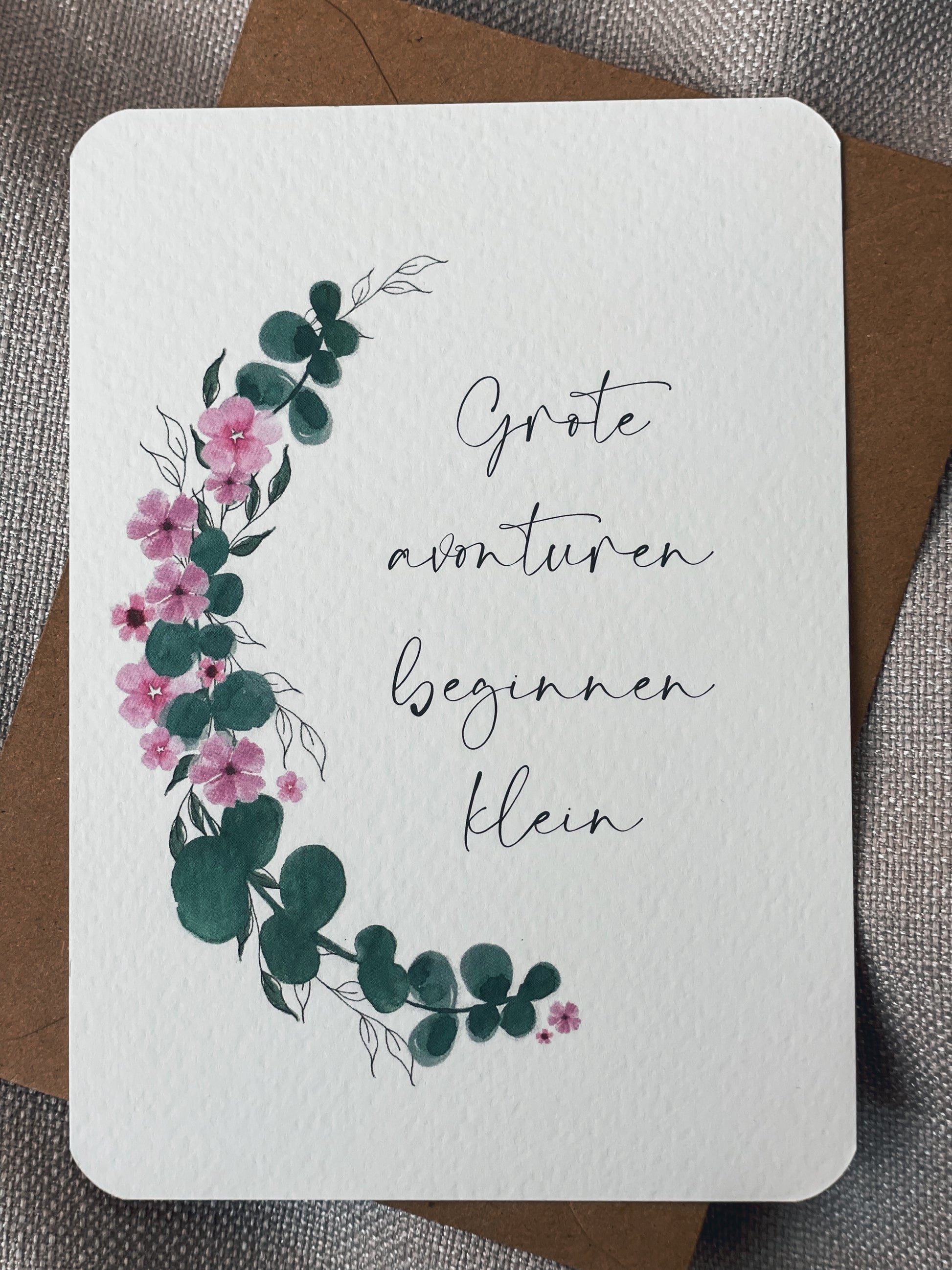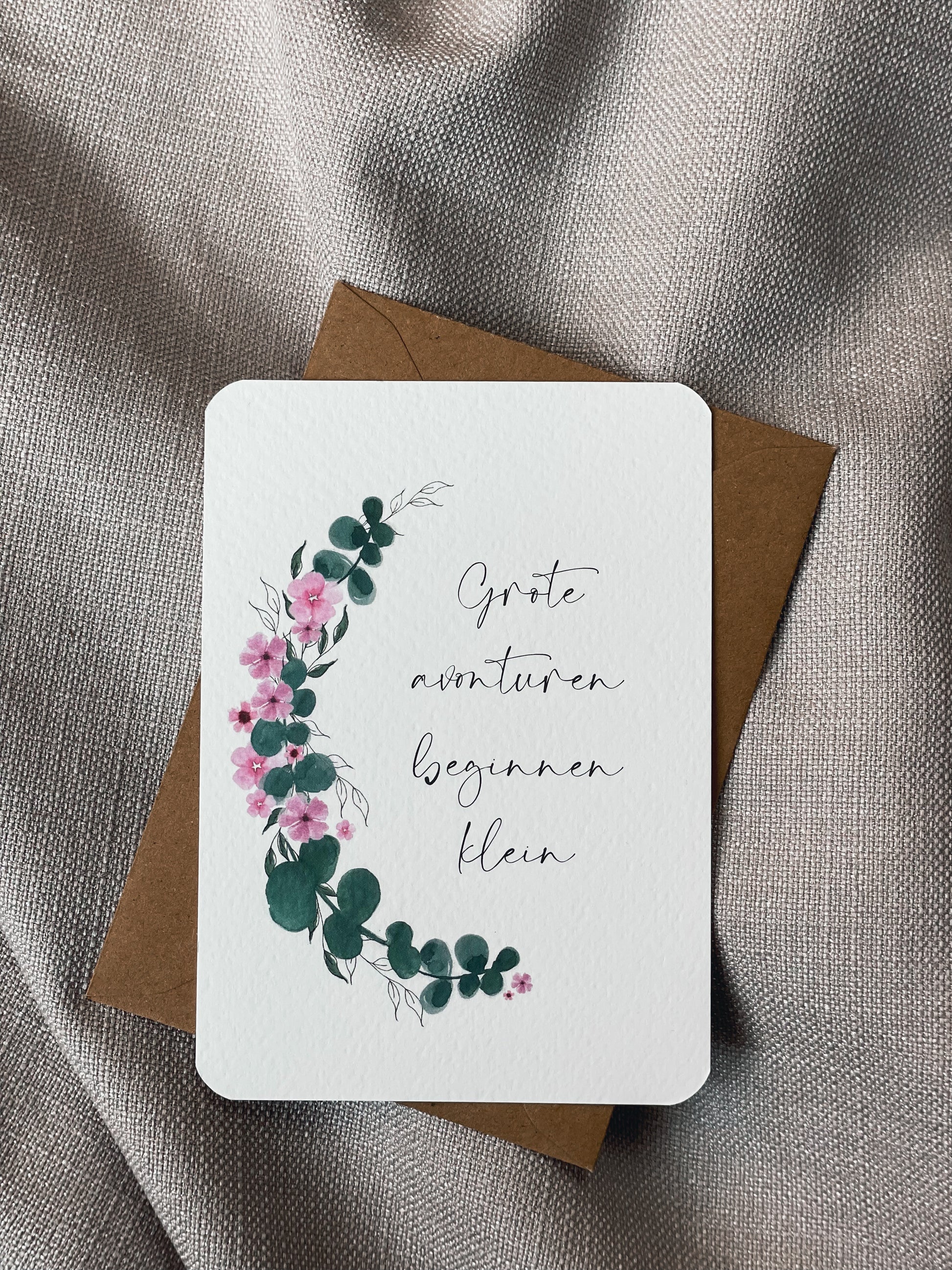 Wenskaarten in A6 formaat met ronde hoeken en bijpassende kraft enveloppe. De kaarten zijn eigen ontwerp en illustratie.