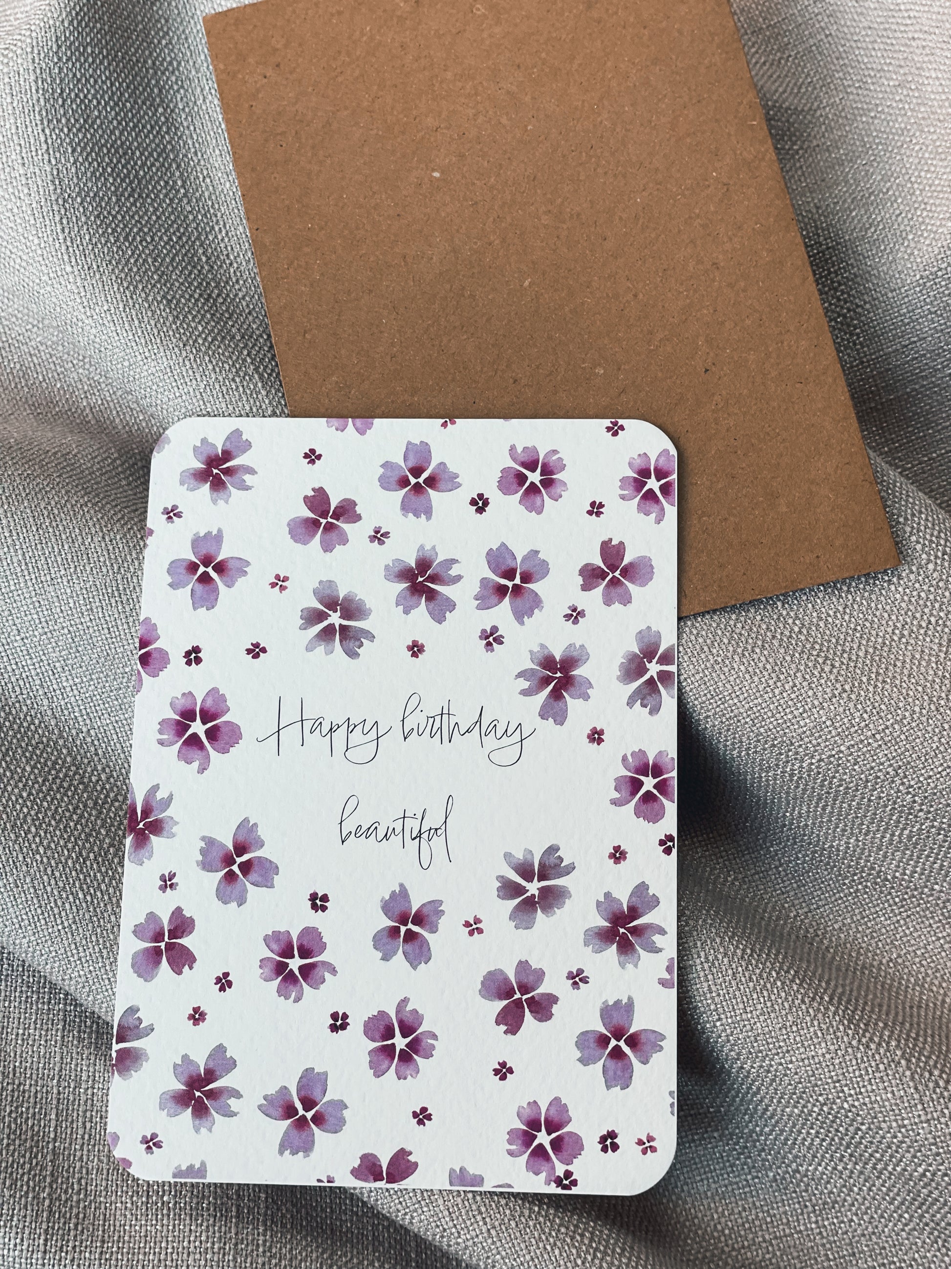 Wenskaarten in A6 formaat met ronde hoeken en bijpassende kraft enveloppe. De kaarten zijn eigen ontwerp en illustratie.