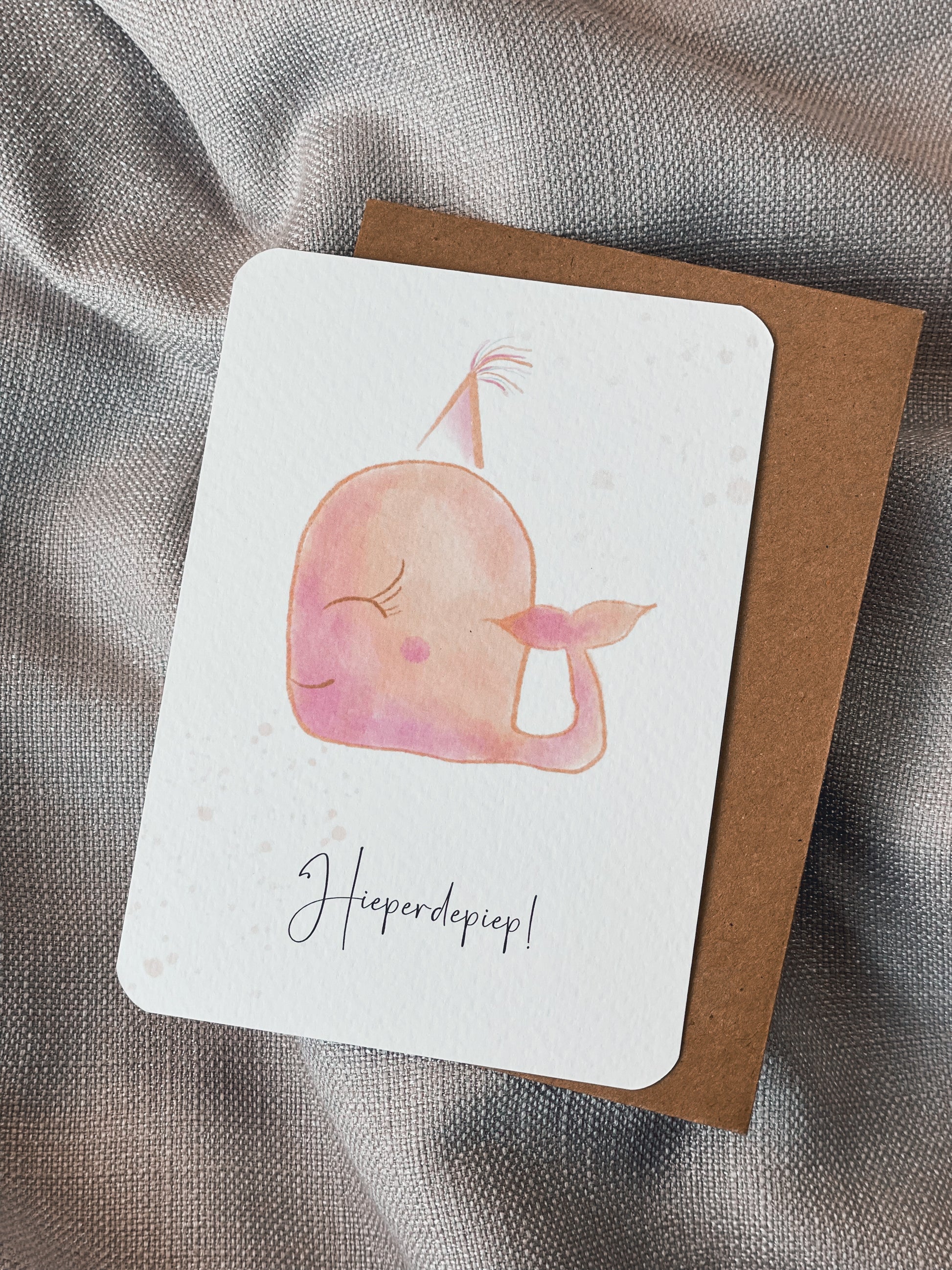 Wenskaarten in A6 formaat met ronde hoeken en bijpassende kraft enveloppe. De kaarten zijn eigen ontwerp en illustratie.