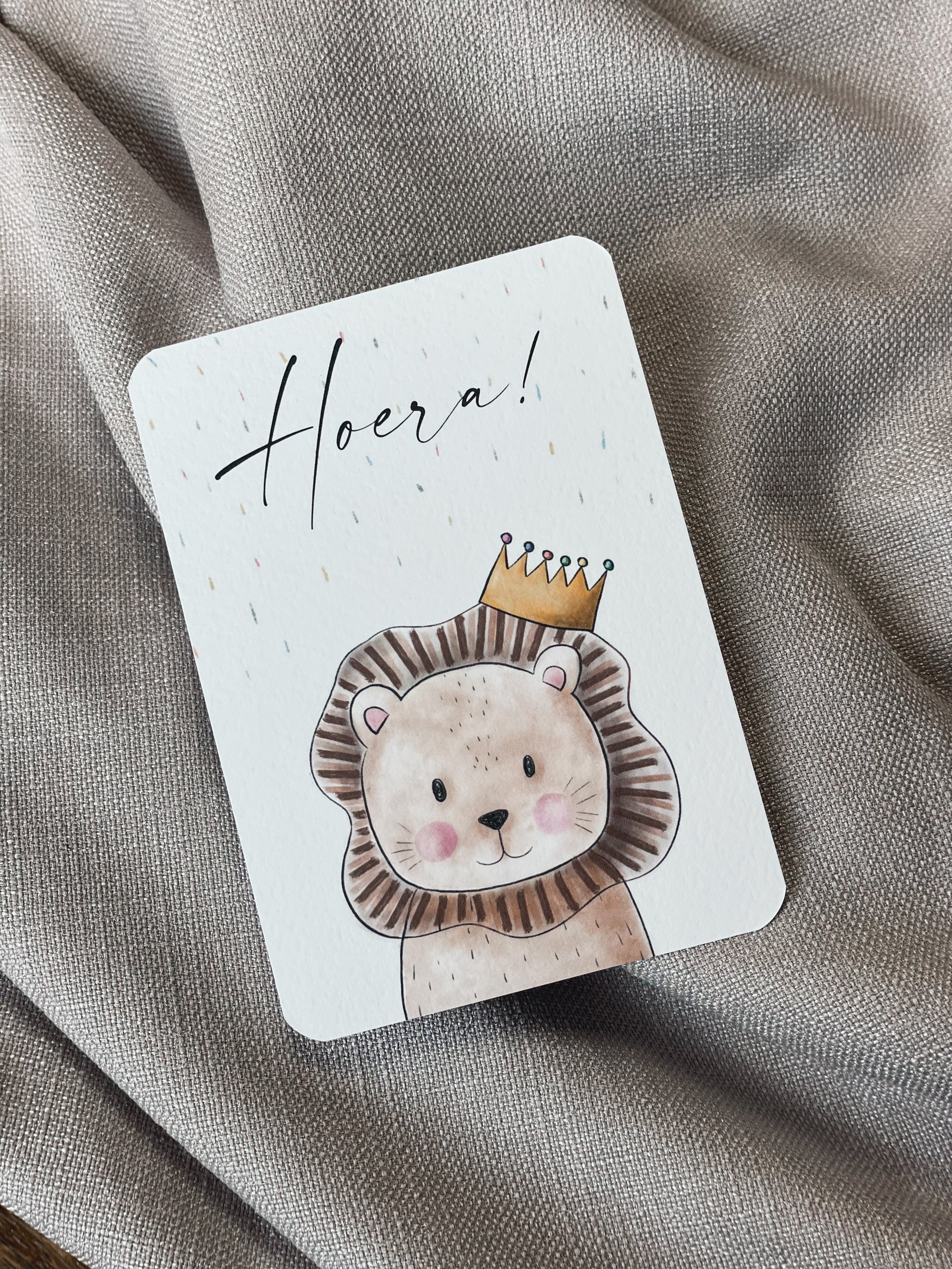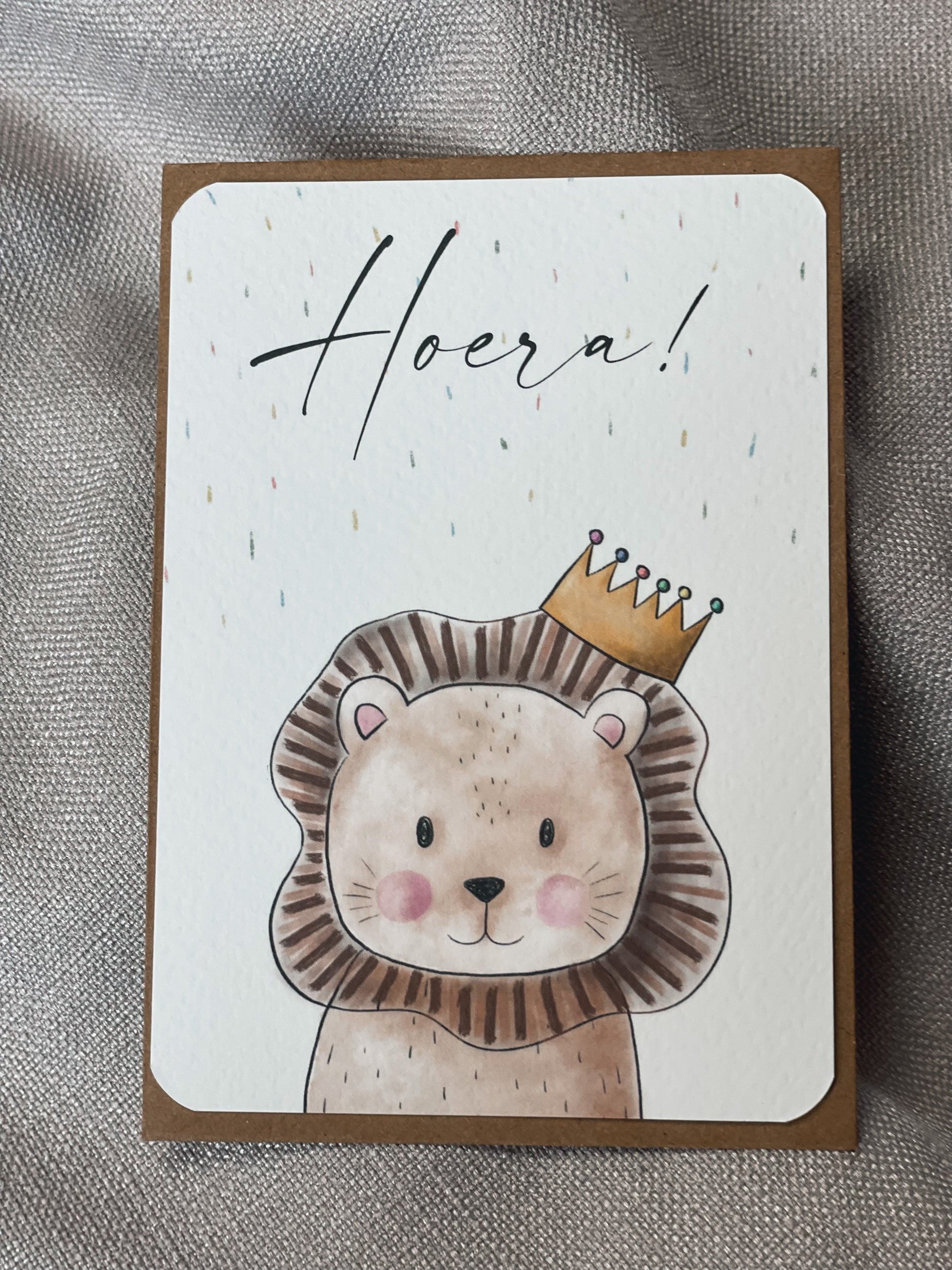 Wenskaarten in A6 formaat met ronde hoeken en bijpassende kraft enveloppe. De kaarten zijn eigen ontwerp en illustratie.
