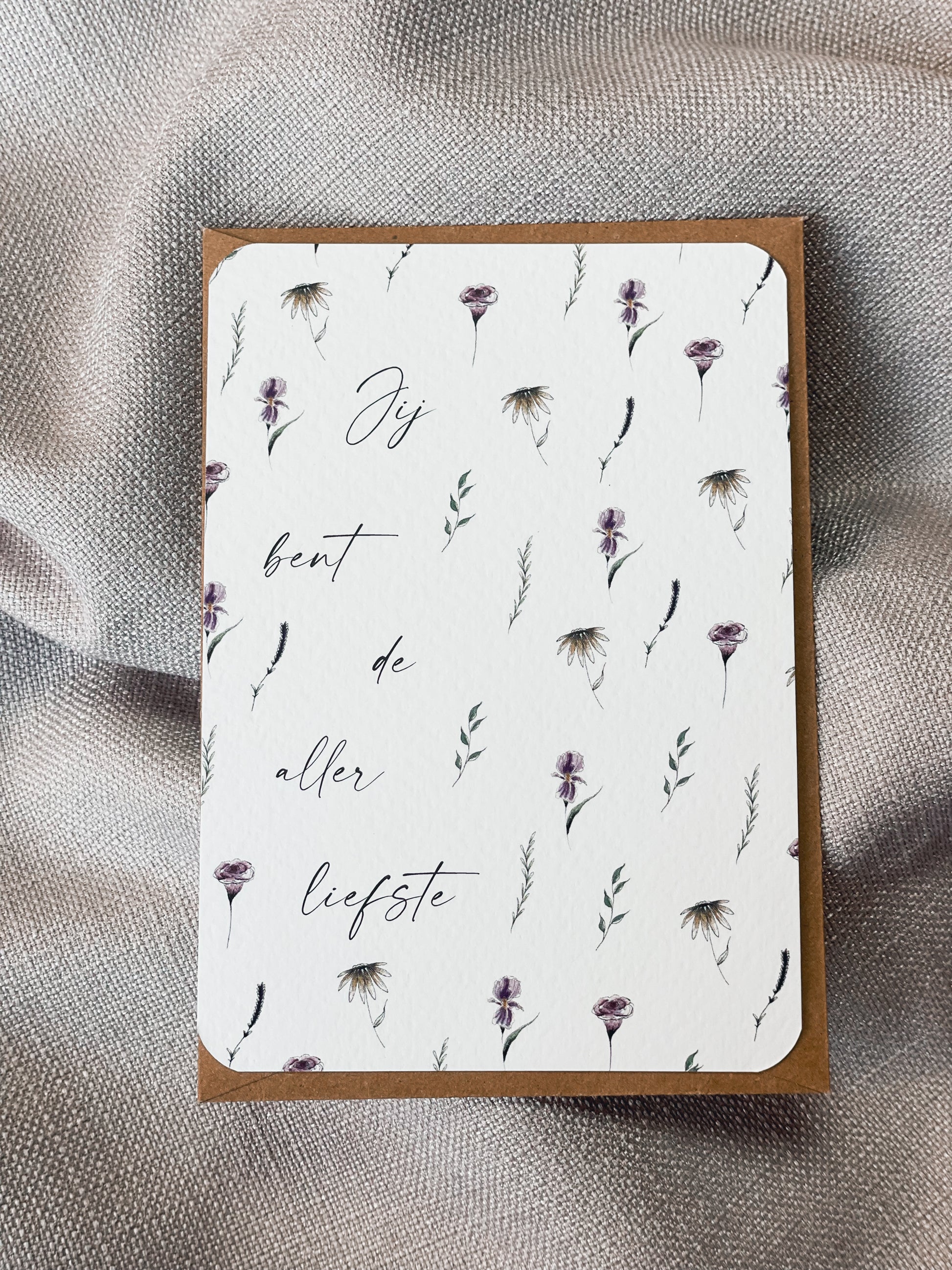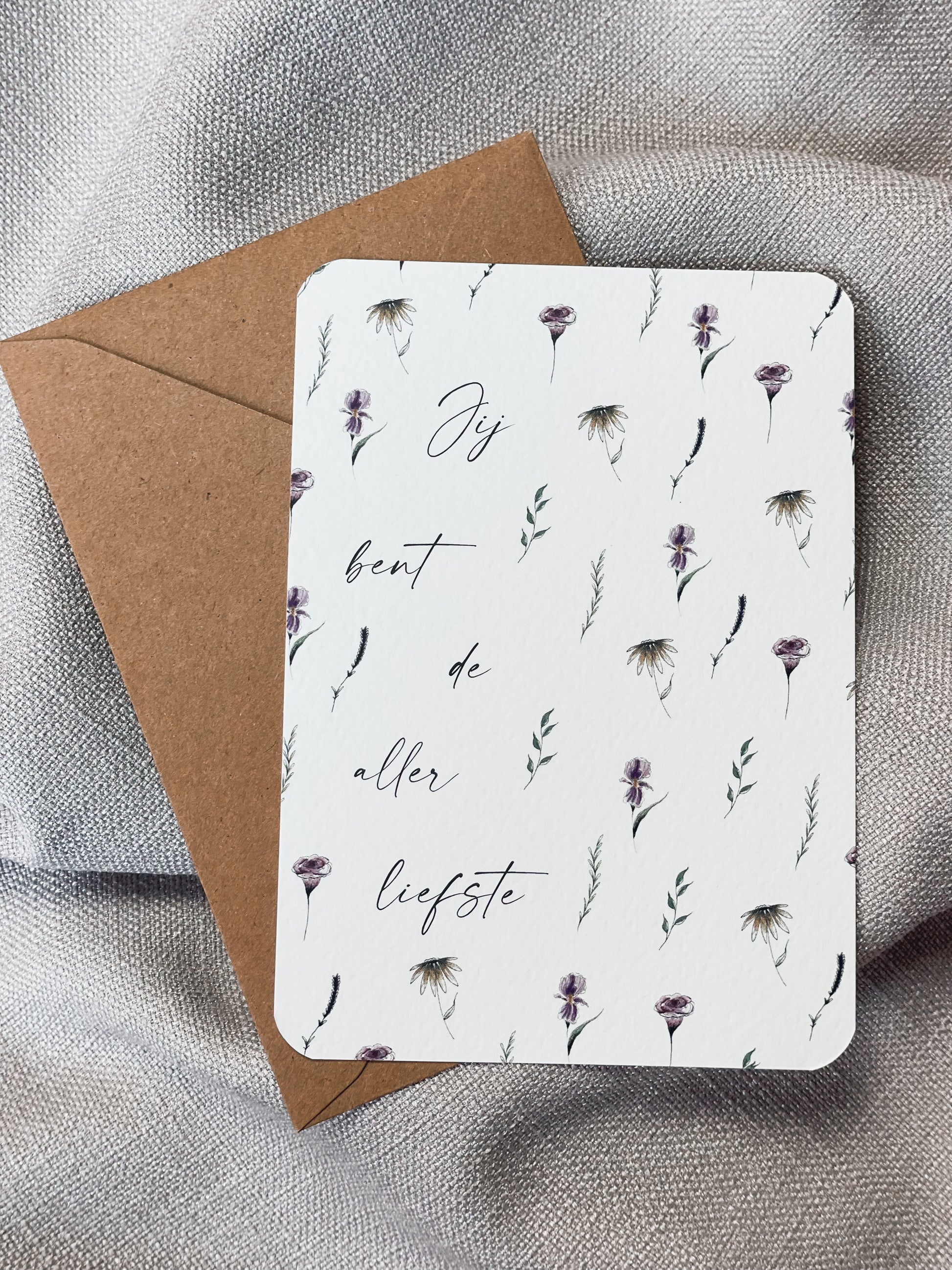 Wenskaarten in A6 formaat met ronde hoeken en bijpassende kraft enveloppe. De kaarten zijn eigen ontwerp en illustratie.