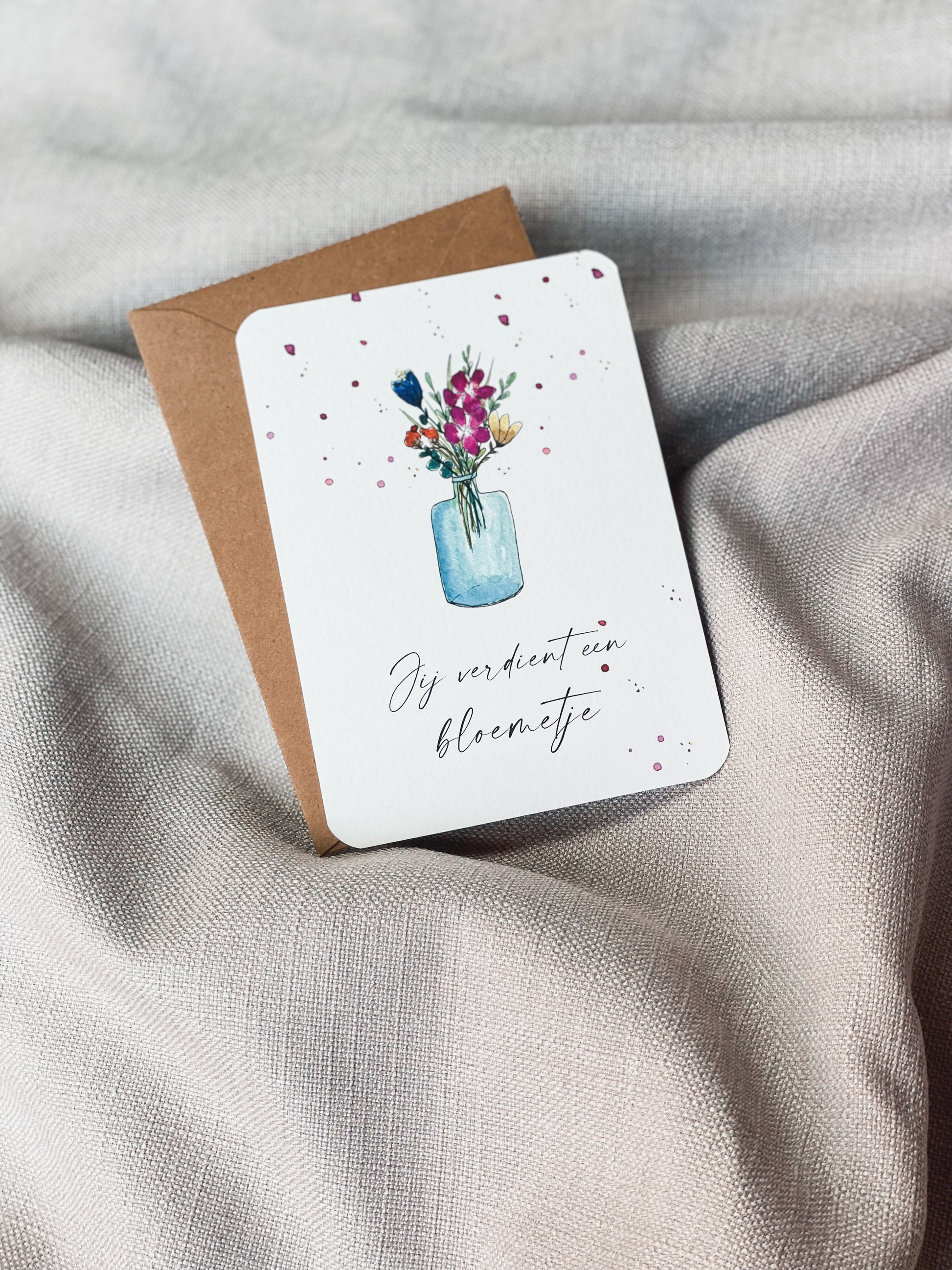 Wenskaarten in A6 formaat met ronde hoeken en bijpassende kraft enveloppe. De kaarten zijn eigen ontwerp en illustratie.