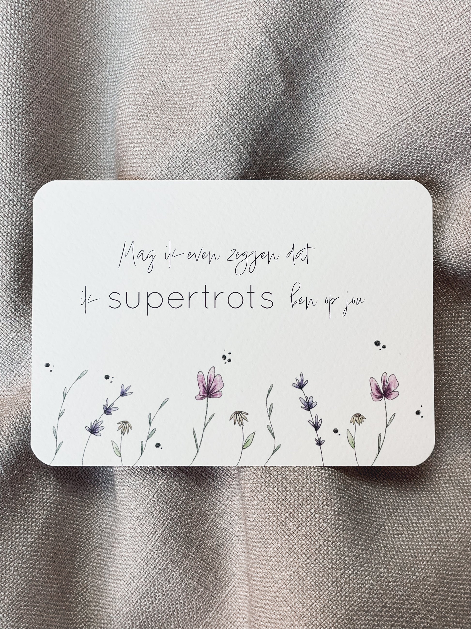 Wenskaarten in A6 formaat met ronde hoeken en bijpassende kraft enveloppe. De kaarten zijn eigen ontwerp en illustratie.