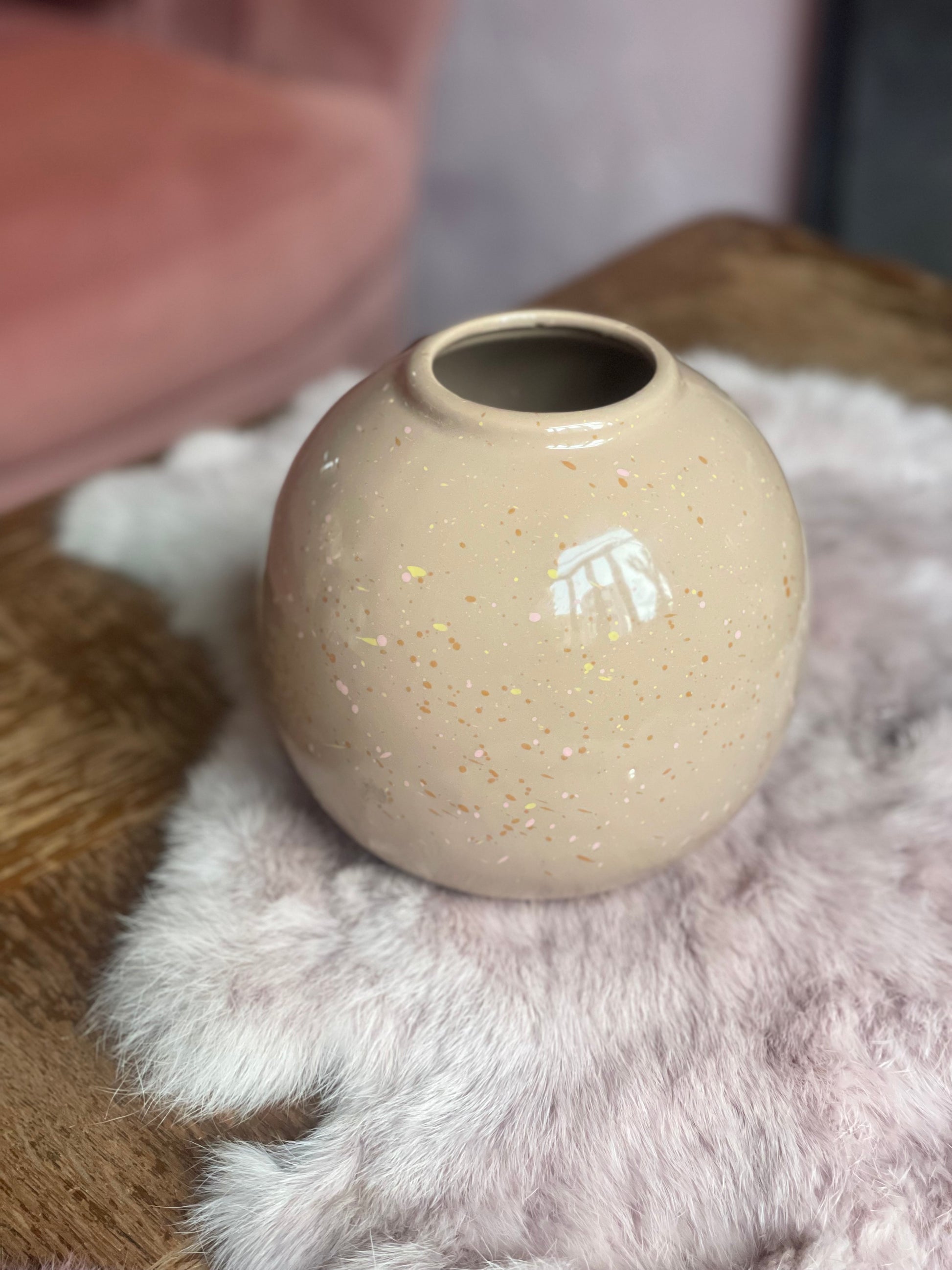 Leuk, beige vaasje met mini roze detail.