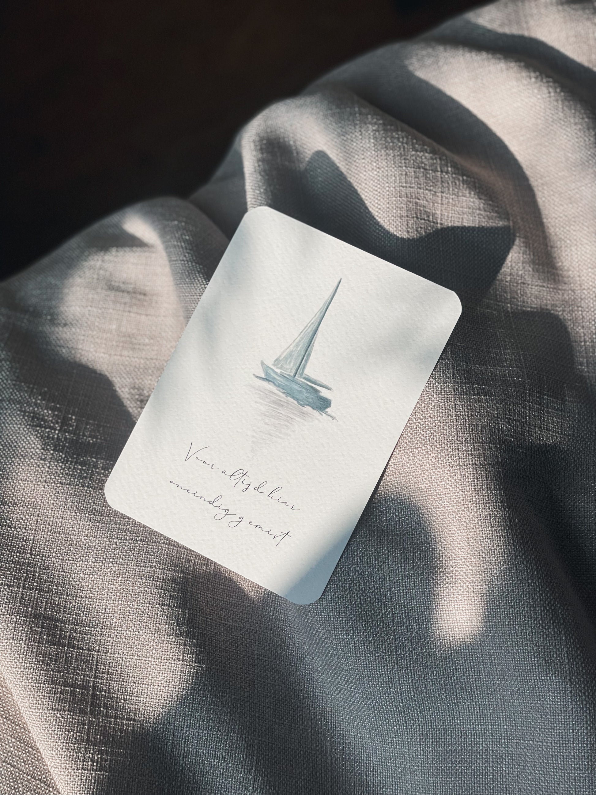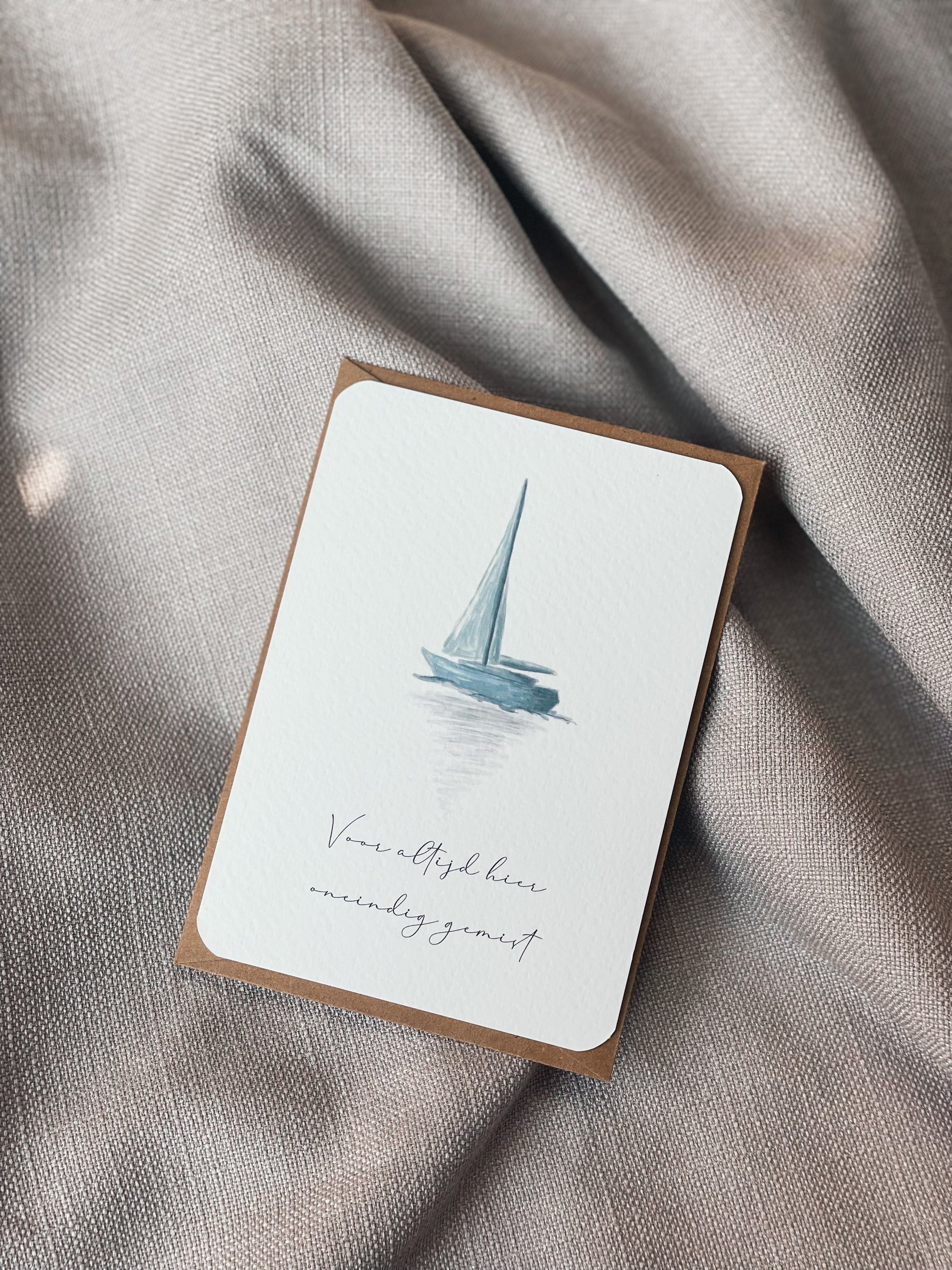 Wenskaarten in A6 formaat met ronde hoeken en bijpassende kraft enveloppe. De kaarten zijn eigen ontwerp en illustratie.